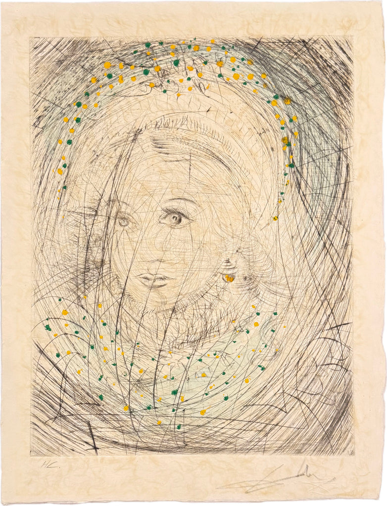 Artist: Salvador Dalí Title: Portrait of Marguerite Medium: Original drypoint with watercolour and roulette Serie: Faust Year: 1968-69 Edition: Colour test proof before the edition of 145 Sizes: 31.8 x 25.9 cm Publisher-editor: Printer Graphics Europe Institution Robbe Bibliograph/Published: Michler &Löpsinger 298 Signature: Signed on pencil right Condition: original conditions this work is sold unframed