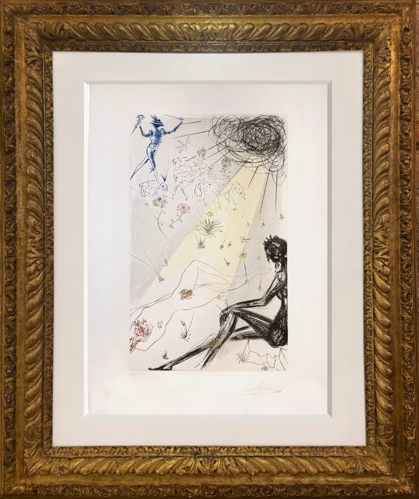 Description: The Songs of Songs of Solomon is a portfolio of 12 drypoint etchings plus colour and gold dust. Each etching is signed by Dali in the lower right. This is a beautifully drawn series inspired to the Song of Solomon, from the Old Testament. The protagonists of Song of Songs are a woman (Shulamite) and a man, and the poem suggests movement from courtship